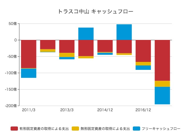 しかし、2017年には突如として120億円を超える設備投資を行なっており、フリーキャッシュフローも大きなマイナスとなっています。