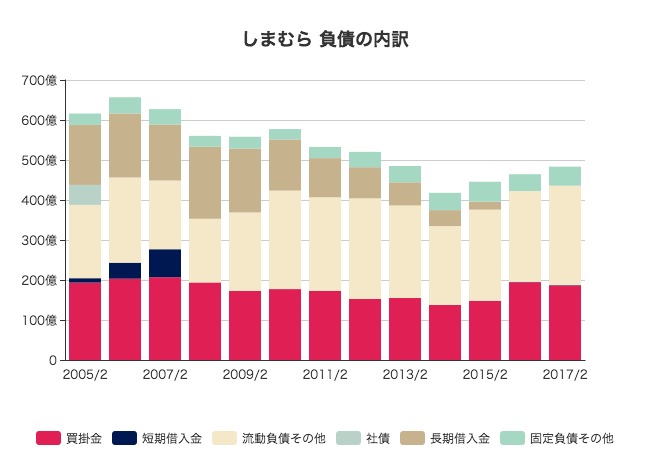 負債の合計は600億円以上あったのが、近年は500億円を割っています。