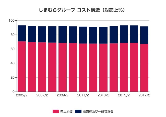 原価率は長期で見ると改善傾向にあり、2005年2月期から2017年2月期までで3.7ポイント改善しています。