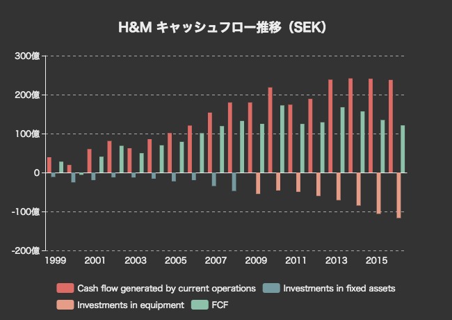 生み出されるFCFは年間120億スウェーデン・クローナ(1656億円)を超えています。しかし、やはり業績の伸びほどには増えていないという印象です。