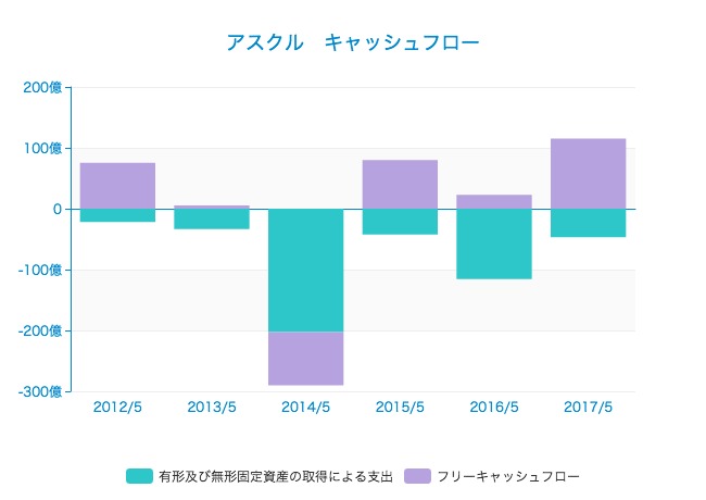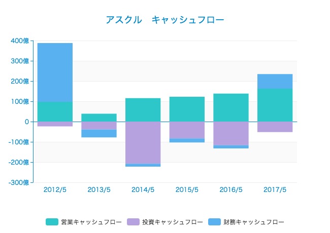 2017/5期において、営業キャッシュフロー162億円、投資キャッシュフローマイナス52億円、財務キャッシュフロー72億円となっています。