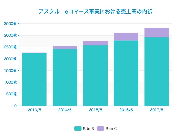 2017/5期における売上高はASKUL(B to B)2919億円、LOHACO(B to C)390億円とASKULの売上の方が大部分を占めています。