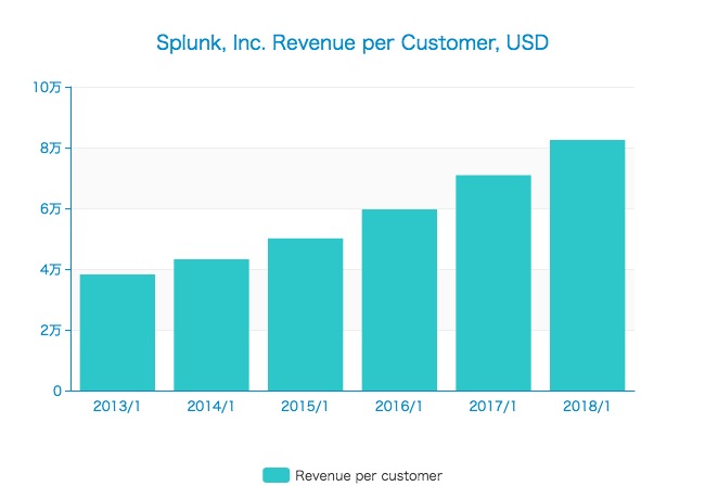 顧客あたりの平均売上は2013/1期の4万ドルから、直近では8万ドルへと倍増しています。