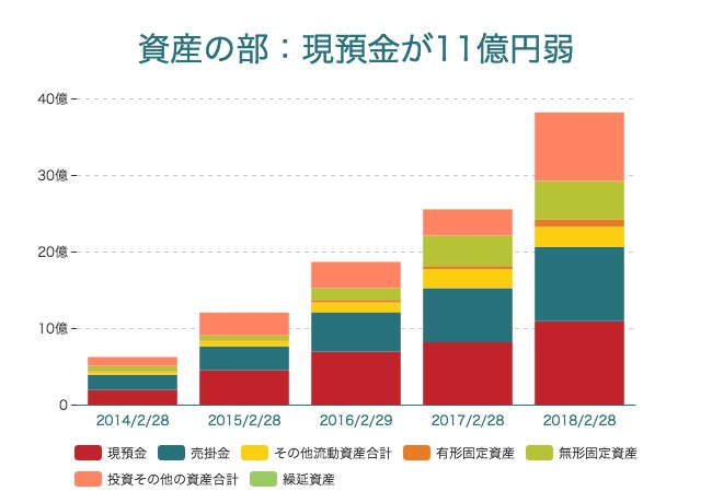 2018/2時点で現預金が10億8900万円あります。資産の合計は38億1700万円で、そのうち28%を占めています。