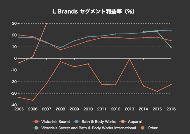 「Victoria's Secret」は15%前後、「Bath & Body Works」は23%前後となっており、「Bath & Body Works」の方がわずかに利益率が高いですね。