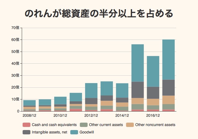 そのため、資産に対するのれん額がとても大きくなっており、その一方で現金はとても少なくなっています。