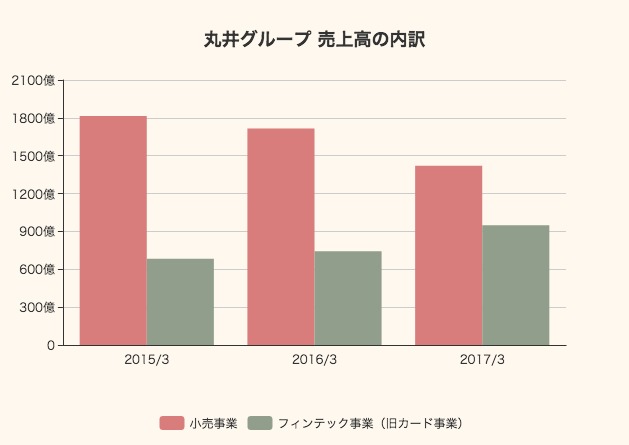 小売事業の売上は減少傾向ですが、フィンテック事業(旧カード事業)の売上収益は684億円から949億円へと増大しています。
