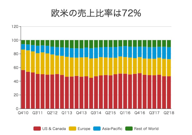 欧米地域の比率はじわじわと下がってはいますが、今でも全体の72%を占めています。