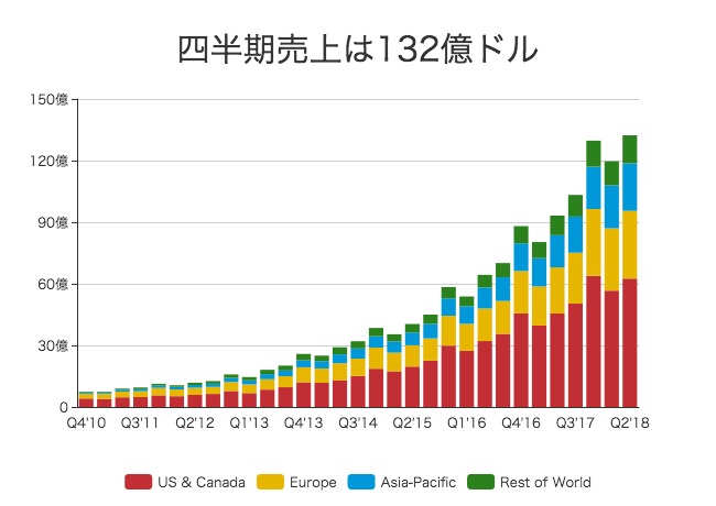 北米で62.5億ドル、ヨーロッパで33億ドル、アジア太平洋で23億ドル、それ以外で13.6億ドルの売上。