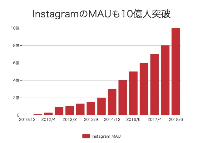 InstagramのMAUも引き続き急成長しています(数字が不定期で発表されるため、横軸が均等でない点に注意)。