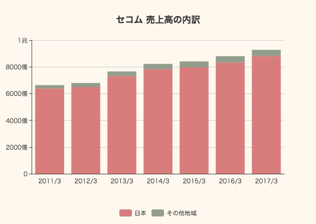 早くから海外展開していたセコムですが、売上の多くは日本に依存しています。