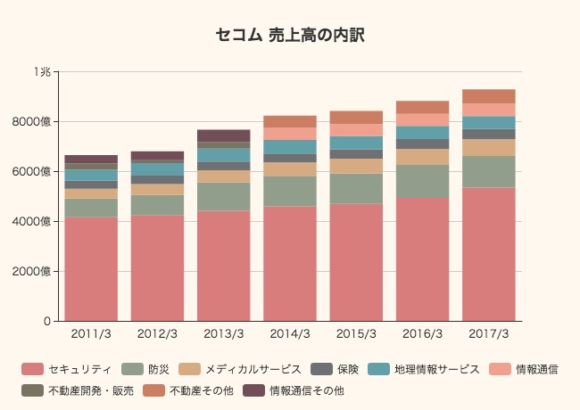 セコムは大きく7つの事業セグメントを展開しており、それぞれの売上は次のようになっています。