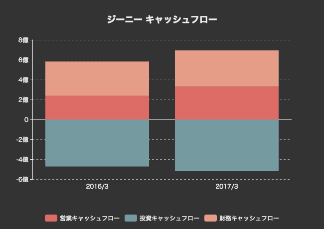 営業キャッシュフローは2-3億円のプラスです。それに財務活動によって調達した資金を投資に回しているようです。