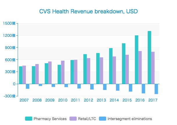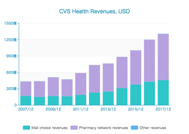 「Pharmacy network revenues」は、CVSが展開する68000もの薬局ネットワークによる売上です。