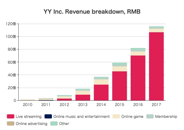 2017年の売上116億元のうち、ライブストリーミングによる売上が107億元(1790億円)と、全体の92%と大きな割合を占めています。