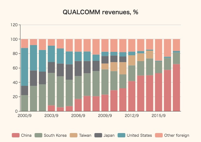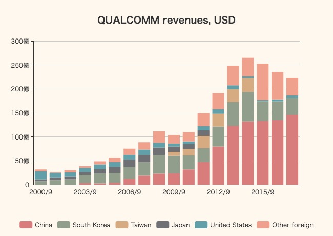 つまり、クアルコムの売上はApple、サムスン、そして中華スマホメーカーで8割くらいの割合を占めるという構造になっています。