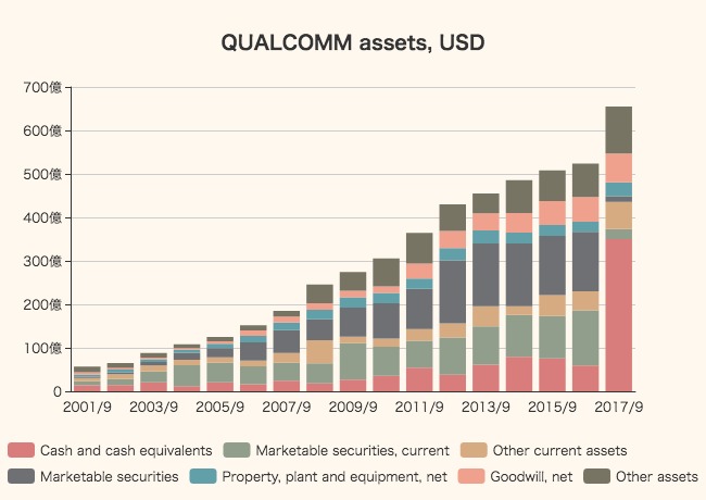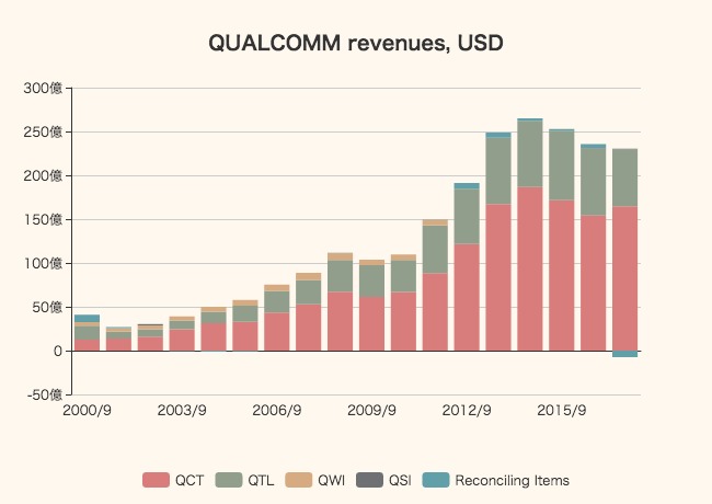 QCTとQTLがそれぞれ160億ドル前後、70億ドル前後の収益をあげていますが、近年は成長が止まっています。