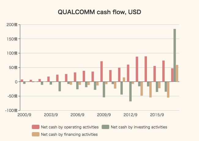 クアルコムについては以前(現代ワイヤレス通信を支えるクアルコムの事業について調べる)取り上げたこともありましたが、今回は2000年頃の事業数値までさかのぼって見てみたいと思います。