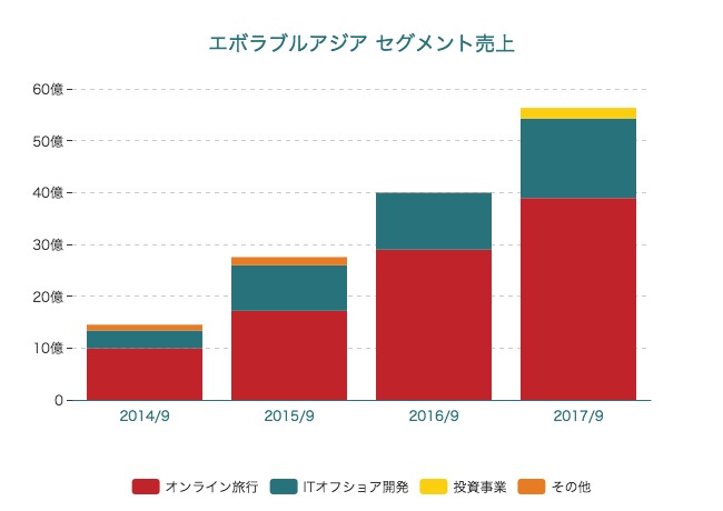 メインのオンライン旅行事業は10億円から39億円、ITオフショア開発事業も3.4億円から15億円と3年で大きく売上を伸ばしています。