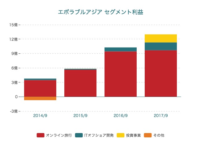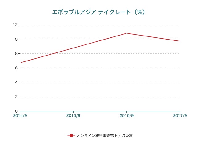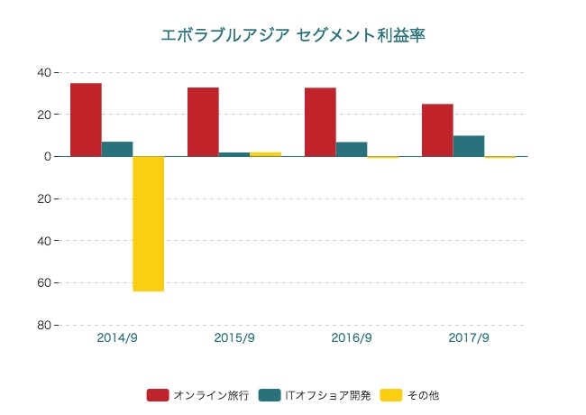 オンライン旅行事業の利益率が前年まで30%前後ととても高かったことがわかります。2017/9期は24.86%と少し利益率が下がっています。