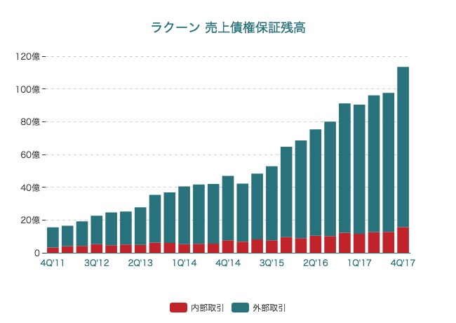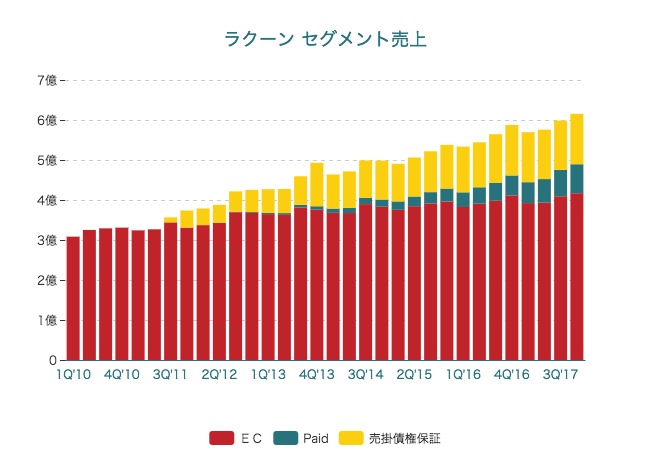 現在は「EC事業」「Paid事業」「売掛保証事業」の3つからラクーンの事業が構成されており、全体業績は次のように推移しています。