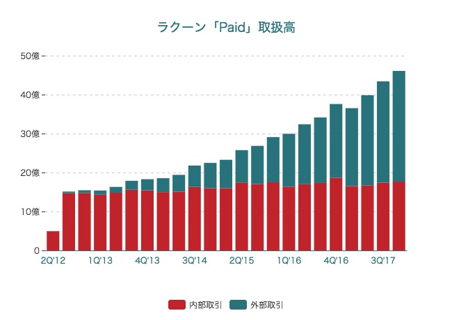 Paid事業は前述の「EC事業」でも一部利用されているため、かつては内部取引も大きくありましたが、最近は外部取引の方が大きくなっており、四半期で28億円に達しています。