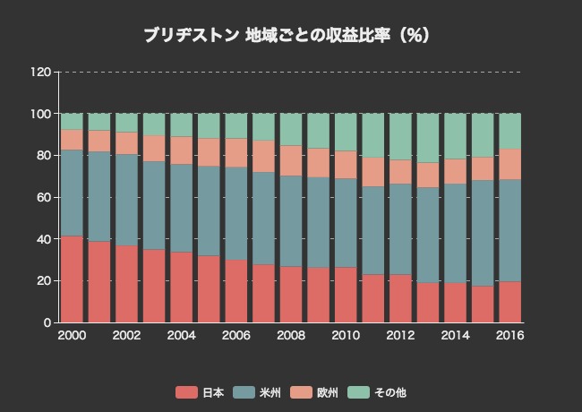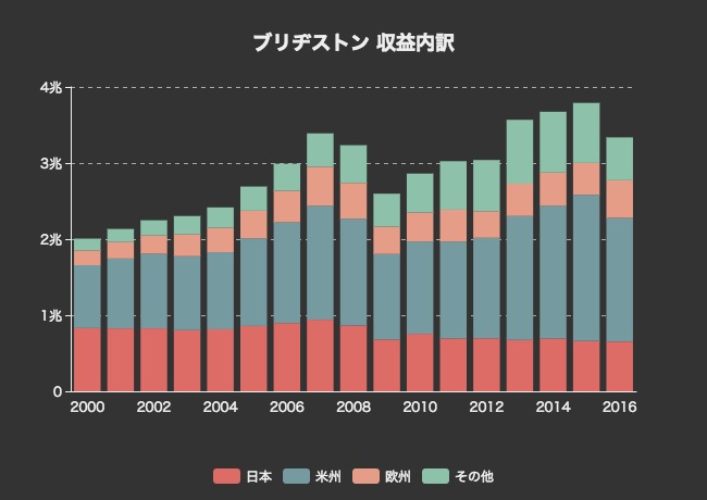 続いて、地域ごとの売上です。グローバル企業と言われて久しいブリヂストンですが、具体的にどのくらいの売上を日本以外であげているのでしょうか。
