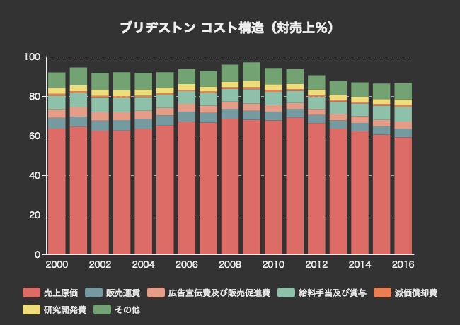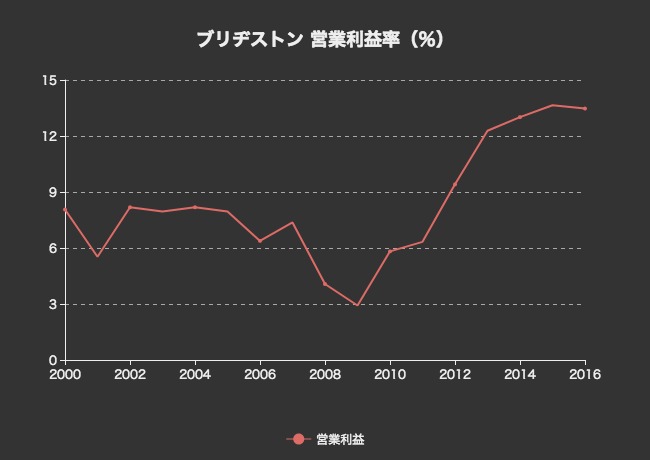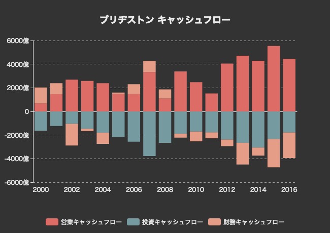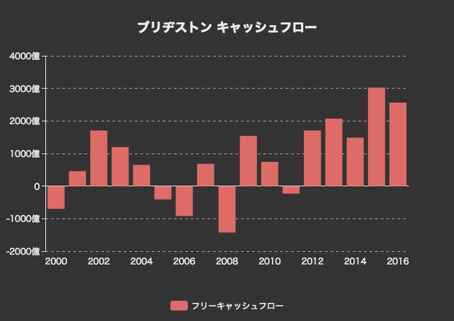 2016年には2566億円のフリーキャッシュフローを生み出しています。ブリヂストンの現在の時価総額は4.11兆円なので、フリーキャッシュフロー倍率はざっくり16倍ということになります。