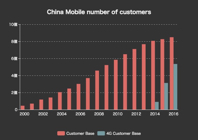 2016年末時点で46万人の従業員と8億4900万人のモバイル契約者、7762万人のブロードバンド契約者という規模。