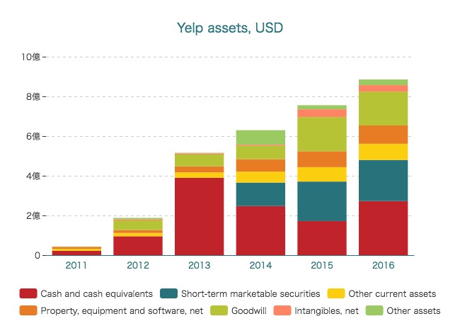 また、のれん(Goodwill)が2015年に1.7億ドルに達しています。この多くは、2015年2月にデリバリープラットフォームのEat24を1.3億ドルで買収したためです。