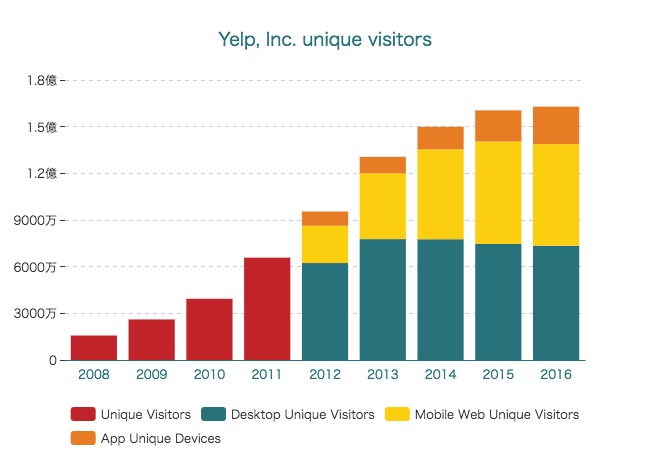 レビュー数は2016年に1億を超え、ユニークビジター数も2013年に1億人を超えています。