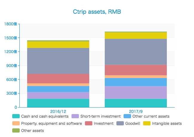 その中で多くの割合を占めているのがのれん(Goodwill)で、562億元(9671億円)とかなりの規模にのぼっています。Ctripはかなり積極的にM&Aによる会社買収を行ってきたようです(今度まとめたい)。