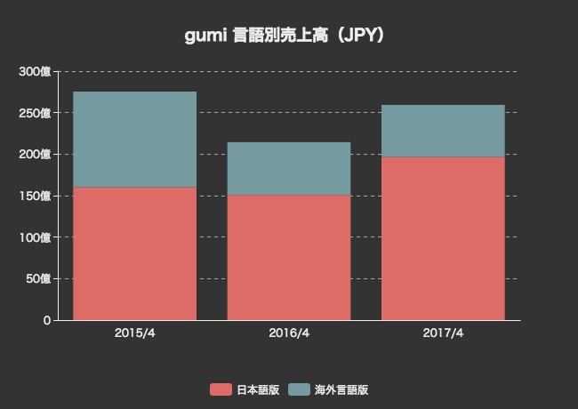 gumiで特徴的なのは、海外言語版の売上の割合が決して小さくないことです。
