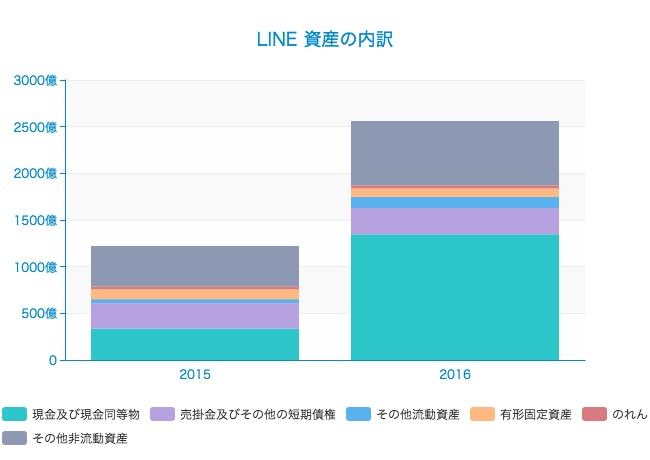LINEの総資産は2015年末の1221億円から2016年末には2560億円に増加しており、その増加分のほとんどは現預金です。現預金だけで丸々1010億円分が増加しています。