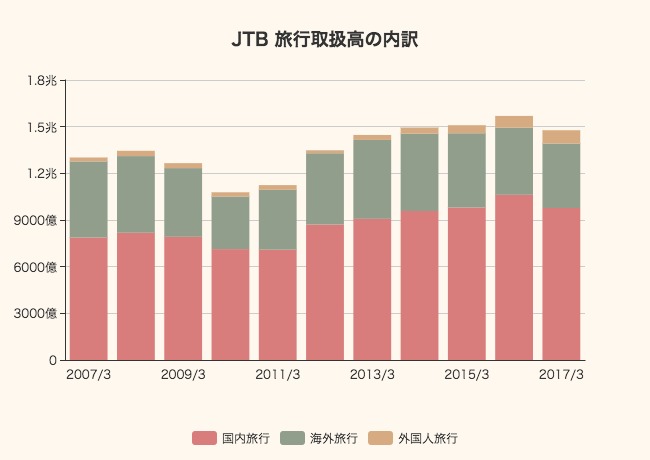 「今後はインバウンド需要が来る」と言われながらも、その規模は国内向け需要に比べるとはるかに小さく、国内最大手のJTBがそちらに経営資源を集中させるのも難しそう。