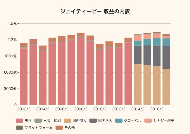 続いて、収益の内訳をみてみます。JTBの事業セグメントは大きく次の5つに分類されています(2014年3月期以降)。