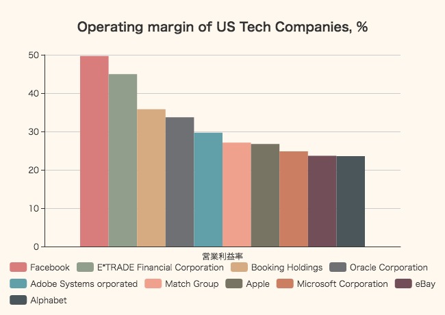 最も高いのはFacebookで、49.7%という水準。ネット証券のE*TRADEも44.97%とかなり高い利益率です。