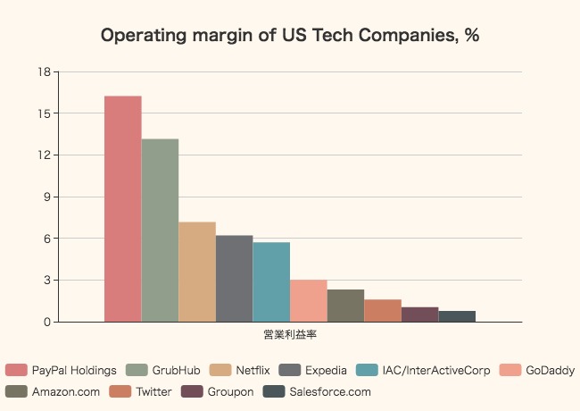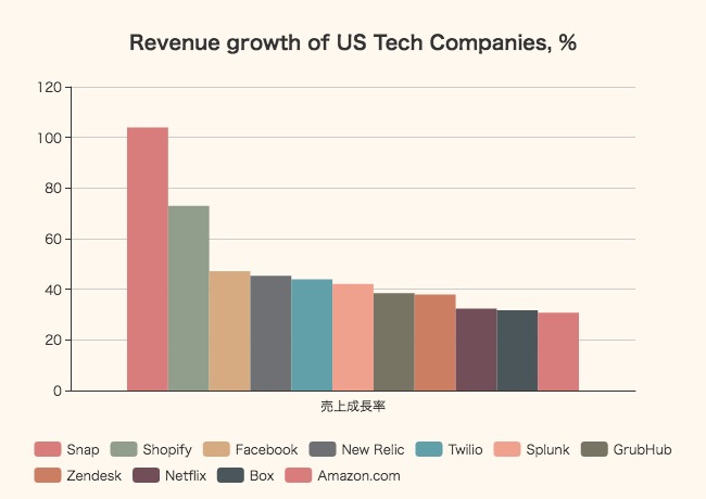 やはり、この中では小規模な会社が多いですが、Facebook(47%)、Netflix(32.4%)、Amazon(30.8%)の三社は売上100億ドルを超えています。