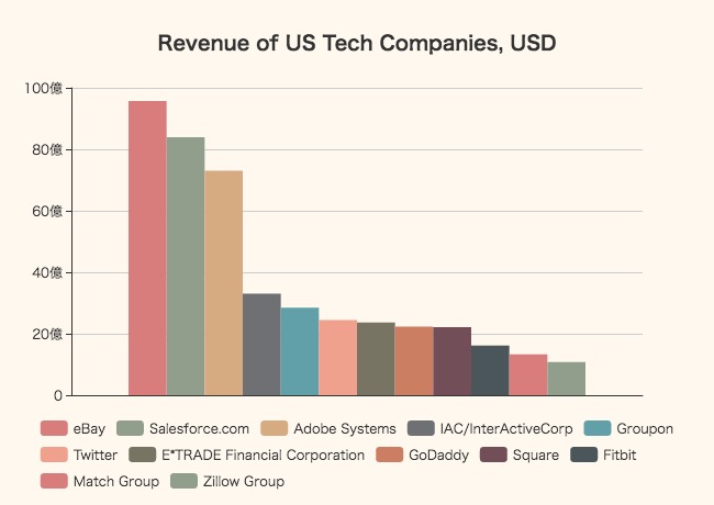 それ以外の企業は40億ドルよりも小さく、IAC(33億ドル)、グルーポン(28億ドル)、Twitter(24億ドル)、ETrade(23億ドル)、GoDaddy(22億ドル)、Square(22億ドル)、Fitbit(11億ドル)、Match Group(13億ドル)、Zillow Group(11億ドル)と続きます。