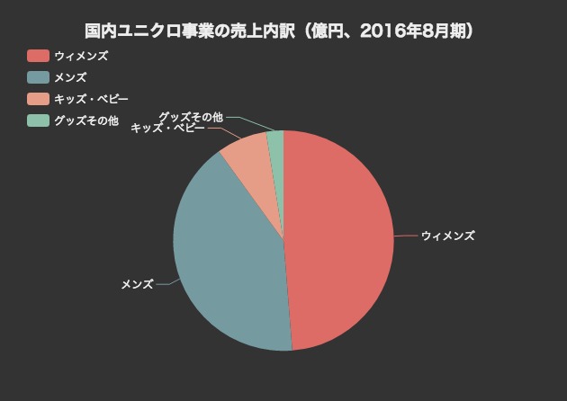 女性向け(ウィメンズ)が3145億円を売上、国内ユニクロ事業の48%を占める。男性向け(メンズ)は3145億円(41%)、キッズ・ベビーは565億円(7.4%)の売上。