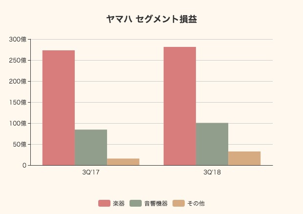 楽器事業の利益は281億円それほど大きくは変わりませんが、音響機器が85億円から100億円、「その他」も16億円から33億円に増益となっています。
