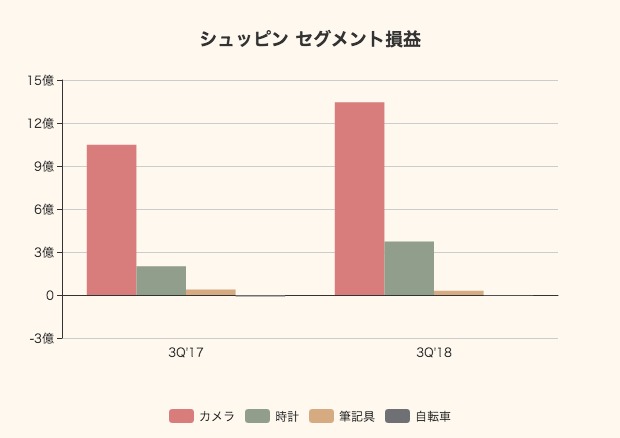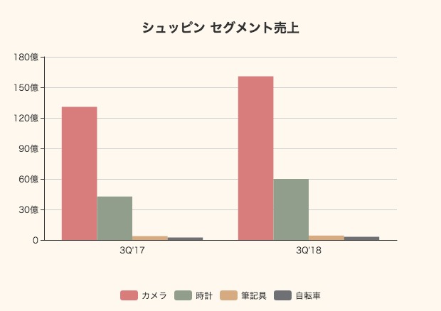 メインのカメラ事業が161億円(前年比23%増)、時計事業が60億円(前年比40%増)と伸びています。