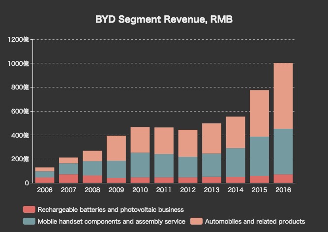 2014年以降、電気自動車(Automobiles and..)の売上高が263億元(4390億円)から550億元(9181億円)へと倍増しています。