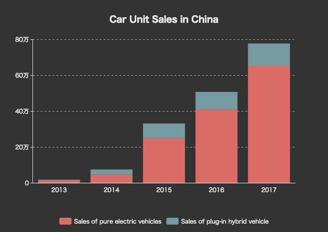 3000万台に迫ろうとしている全体の自動車販売台数と比べるとはるかに小さいものの、2016年には50万台を突破し、2013年の1.76万台と比べると3年で30倍近くに増えています。