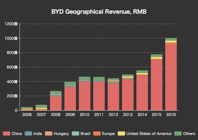 充電池が事業の中心だった2007年までは海外の売上が大きかったものの、電気自動車の製造を本格化した2008年以降は、一貫して中国国内の売上が多くを占めています。