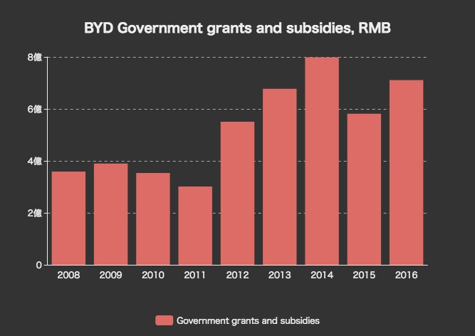 また、BYDの損益計算書には特別利益として政府からの補助金が計上されています。